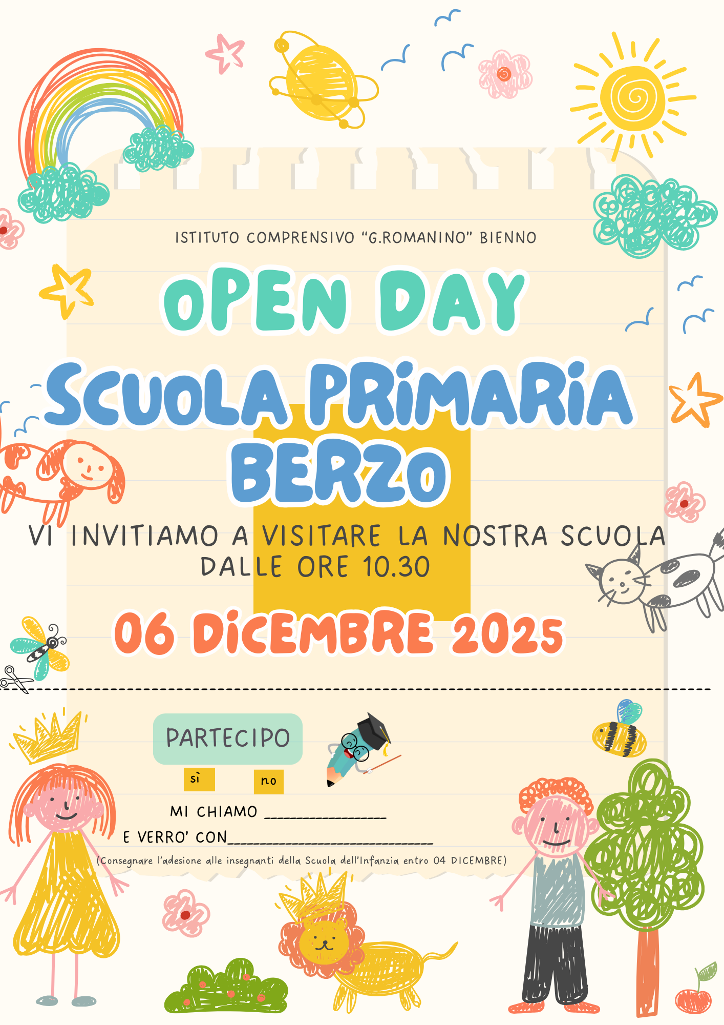 Sabato 6 dicembre 2025 a partire dalle ore 10.30 le insegnanti e gli alunni della Scuola Primaria di Berzo Inferiore aprono le porte alle famiglie, in vista delle iscrizioni per l’a.s. 2026/2027. Sarà l’occasione per conoscere la nostra scuola che segue il modello Senza Zaino, l’offerta formativa e organizzativa, le insegnanti e ci sarà anche la possibilità di un momento laboratoriale dei bambini di 5 anni con gli alunni della scuola.